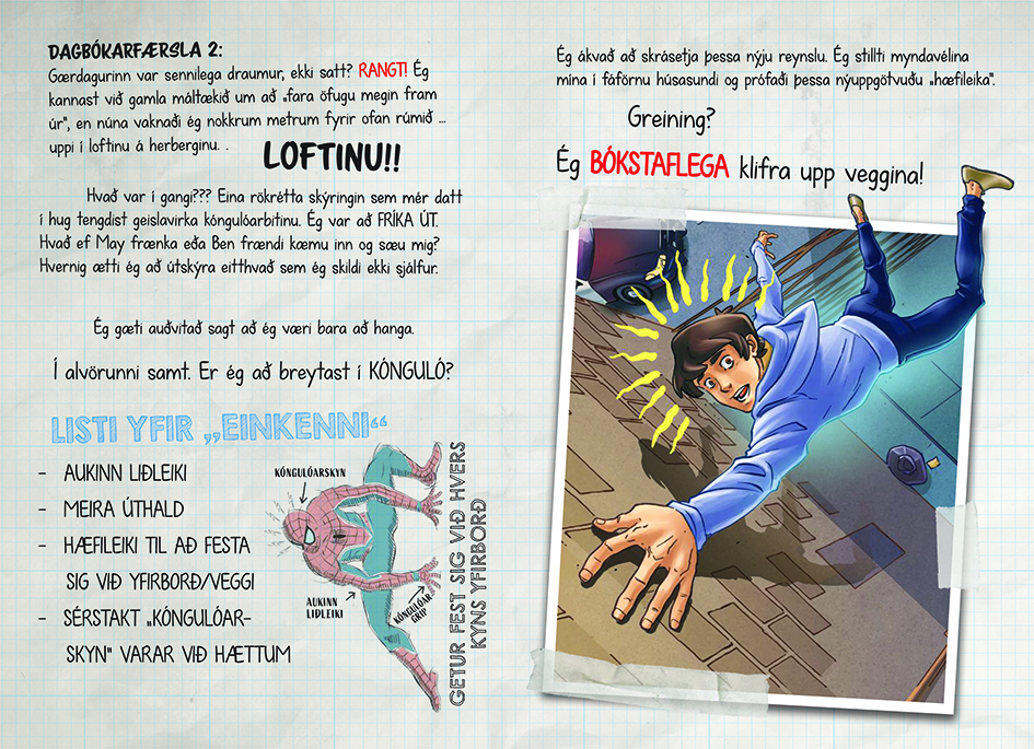Lestu um það í háleynilegri dagbók Peters Parkers sem er stútfull af hugsunum hans, kroti, hetjumyndum og frásögnum af stórfenglegustu bardögunum. Hann sprangar, spaugar og – vinur þinn KÓNGULÓARMAÐURINN er mættur til leiks!